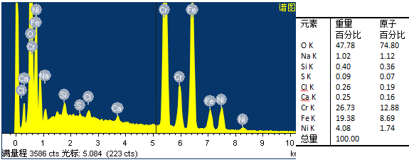 (5)送檢管子內壁存在很多的蝕坑。內壁微觀形貌為典型點蝕坑形貌,這與表面腐蝕產物中含有氯元素一致。