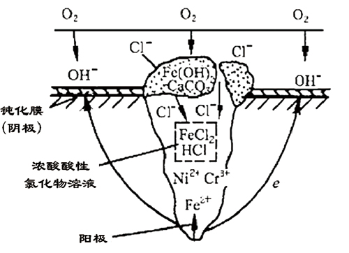 (1)環境因素的影響:不銹鋼點蝕是在特定腐蝕介質中發生的,點蝕通常發生在含有鹵素陰離子的溶液中,其中以氯化物、溴化物侵蝕性最強。另外,溶液所處的狀態對耐蝕性也有影響,溶液靜止狀態比流動狀態時容易發生點腐蝕。一種解釋認為流速對沉積物的影響所致,因為點蝕在鋼的表面有雜質附著時容易發生,在沉積物下面供氧不足,形成濃差電池,鈍態易被破壞。