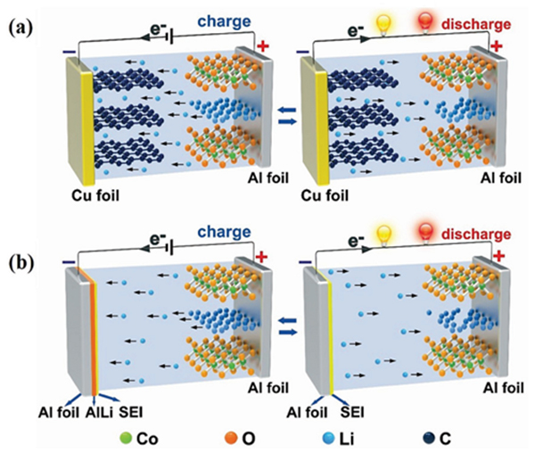 這種構(gòu)造不僅可以有效降低電池自重和體積,顯著提高質(zhì)量和體積能量密度,而且大大降低了生產(chǎn)制造成本,同時具有廣泛的普適性。研究結(jié)果表明,采用鈷酸鋰為正極、鋁箔為負(fù)極的全電池(LCO-Al)能量密度可達(dá)到263 Wh/kg,充放電循環(huán)250次后電池容量保持在81%;以磷酸鐵鋰為正極、鋁箔為負(fù)極的全電池(LFP-Al)能量密度達(dá)到163 Wh/kg,充放電循環(huán)500次后電池容量保持在84%;以鎳鈷錳酸鋰三元材料為正極、鋁箔為負(fù)極的全電池(NCM-Al)能量密度達(dá)到258 Wh/kg,充放電循環(huán)250次后電池容量保持86%。該研究成果具有巨大的產(chǎn)業(yè)化前景,并有望改變現(xiàn)有鋰離子電池產(chǎn)業(yè)格局。