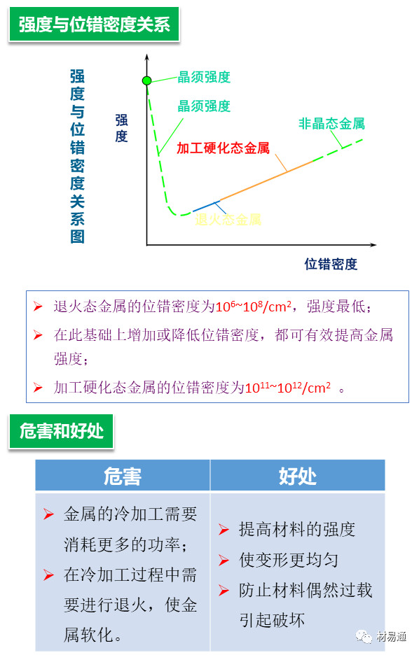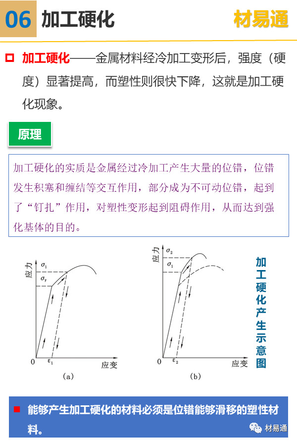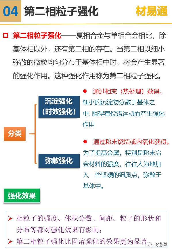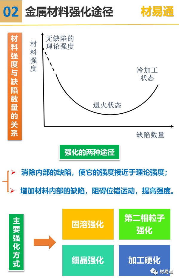 金屬材料的強(qiáng)化途徑不外兩個,一是提高合金的原子間結(jié)合力,提高其理論強(qiáng)度,并制得無缺陷的完整晶體,如晶須。已知鐵的晶須的強(qiáng)度接近理論值,可以認(rèn)為這是因為晶須中沒有位錯,或者只包含少量在形變過程中不能增殖的位錯??上М?dāng)晶須的直徑較大時,強(qiáng)度會急劇下降。另一強(qiáng)化途徑是向晶體內(nèi)引入大量晶體缺陷,如位錯、點缺陷、異類原子、晶界、高度彌散的質(zhì)點或不均勻性(如偏聚)等,這些缺陷阻礙位錯運(yùn)動,也會明顯地提高金屬強(qiáng)度。事實證明,這是提高金屬強(qiáng)度最有效的途徑。對工程材料來說,一般是通過綜合的強(qiáng)化效應(yīng)以達(dá)到較好的綜合性能。