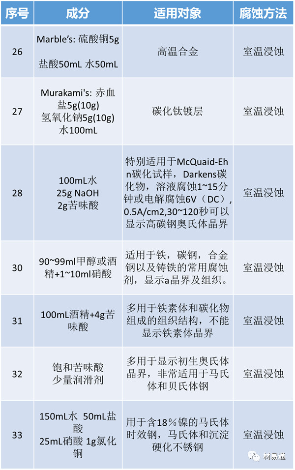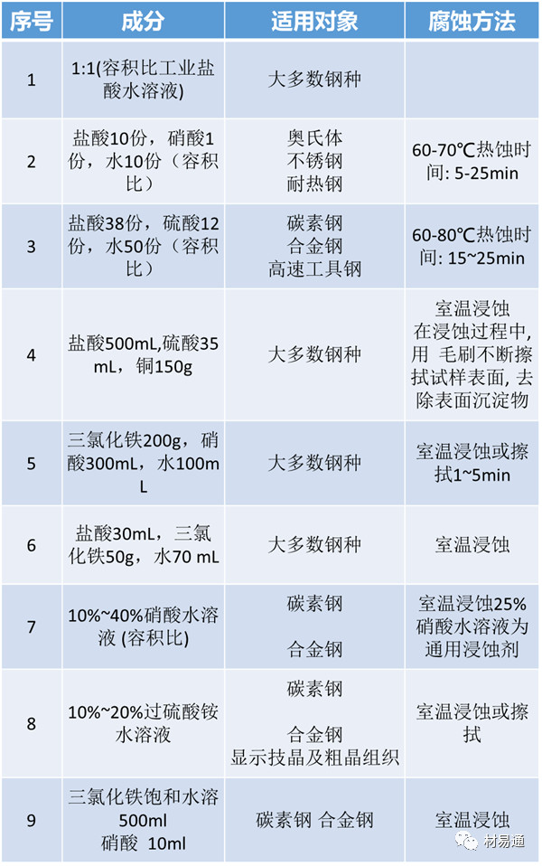 在與金屬有關(guān)的實(shí)驗(yàn)過(guò)程中,往往不可避免的要用到金相試樣制備技術(shù),而其中最為關(guān)鍵的是針對(duì)一定的材料選擇合適的侵蝕劑及侵蝕方法,只有這樣才能制好我們需要的金相試樣。這里,我們就將常見(jiàn)的侵蝕劑及其適用對(duì)象與方法簡(jiǎn)單羅列如下。