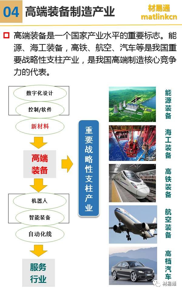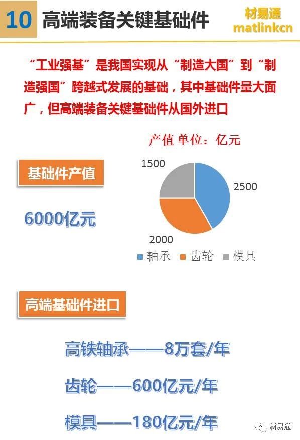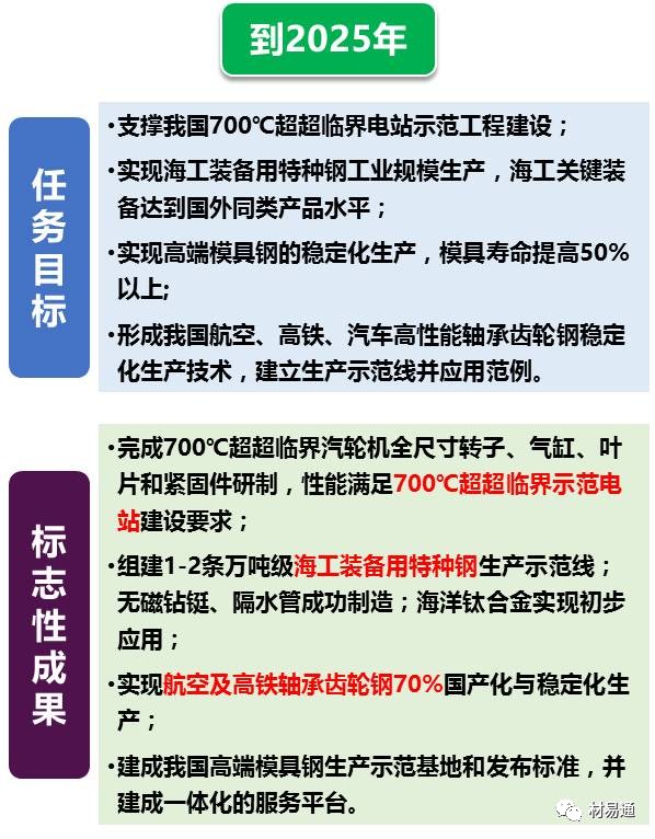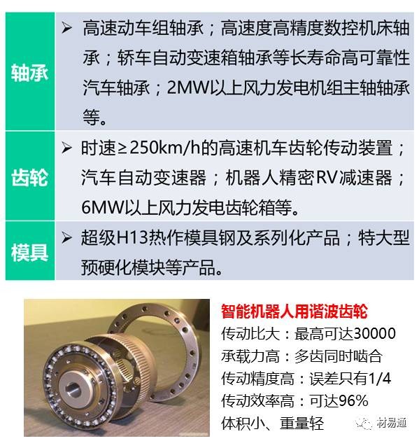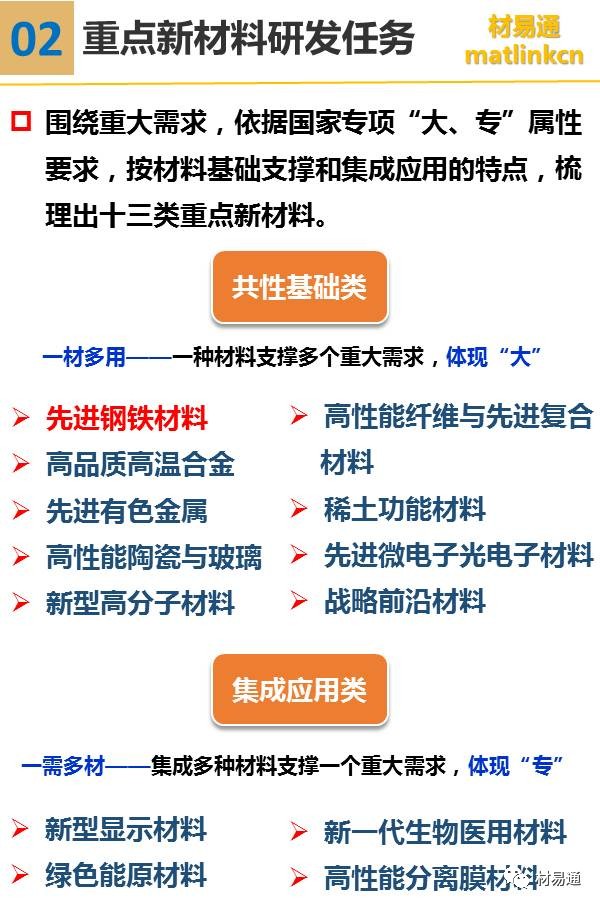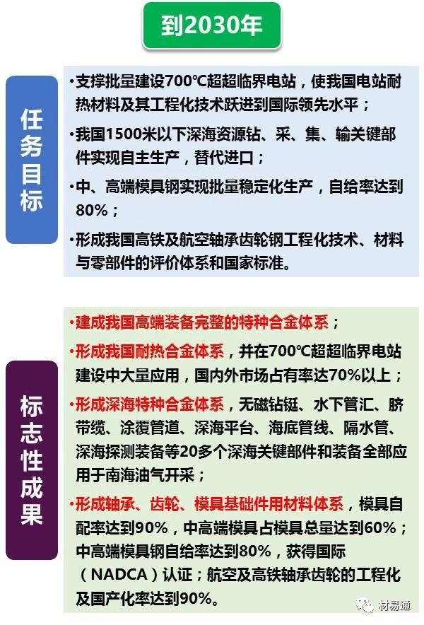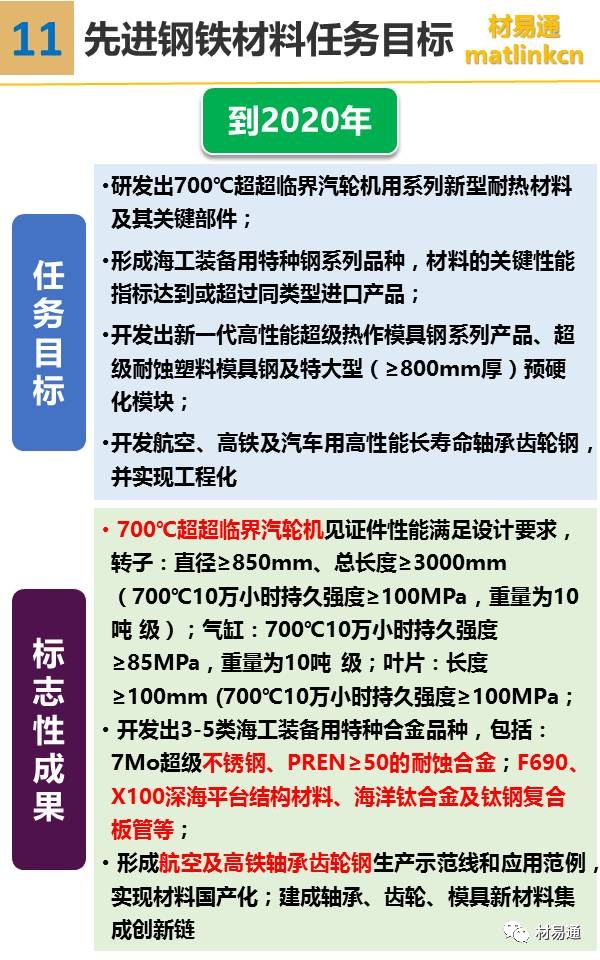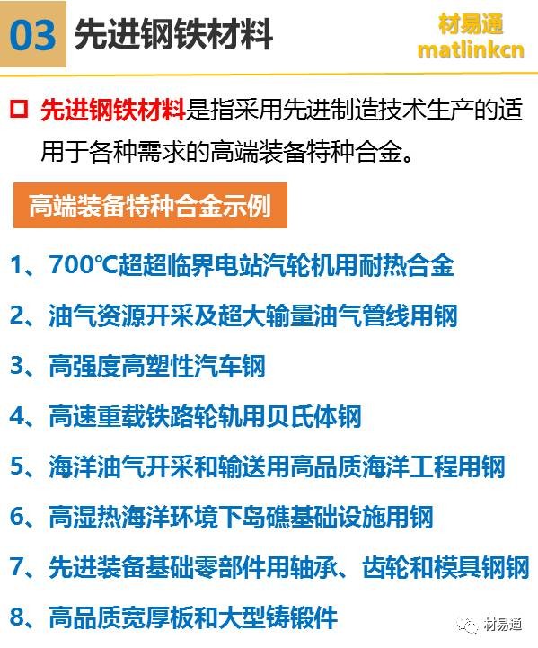 其中先進鋼鐵材料包括高溫合金及耐熱合金、高性能輕合金及其超大規格構件、超級不銹鋼及其它耐蝕合金、核電用鋼、高強塑級鋼、軸承/齒輪/模具鋼等特鋼等。